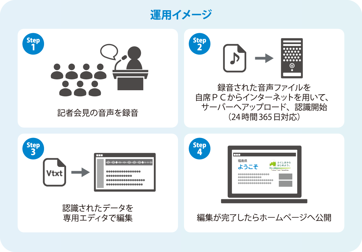国内外の多くの皆さんに、知事記者会見の様子をより分かりやすく、迅速に伝える為、YouTubeによるライブ配信と併せて、県ホームページへの会見録掲載を速やかに行う事とし、「ProVoXT」を導入しました。