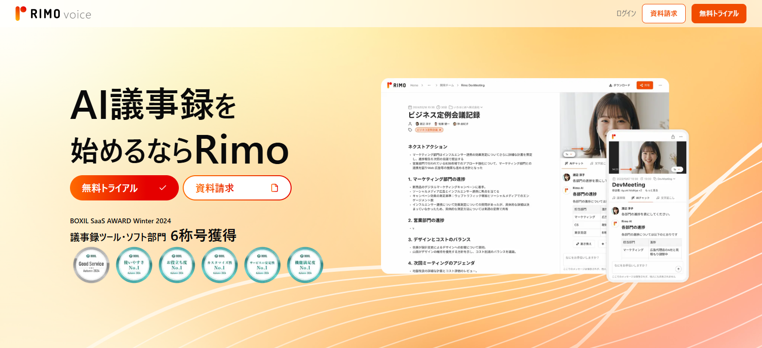 「Rimo」は、会議の音声や動画ファイルをアップロードするだけで、短時間で文字起こしが完了するAI議事録ツールです。ZoomやMicrosoft Teams、Google Meet などのオンライン会議アプリにも対応しており、一度設定しておけば、これから実施されるすべての会議が文字起こしされます。