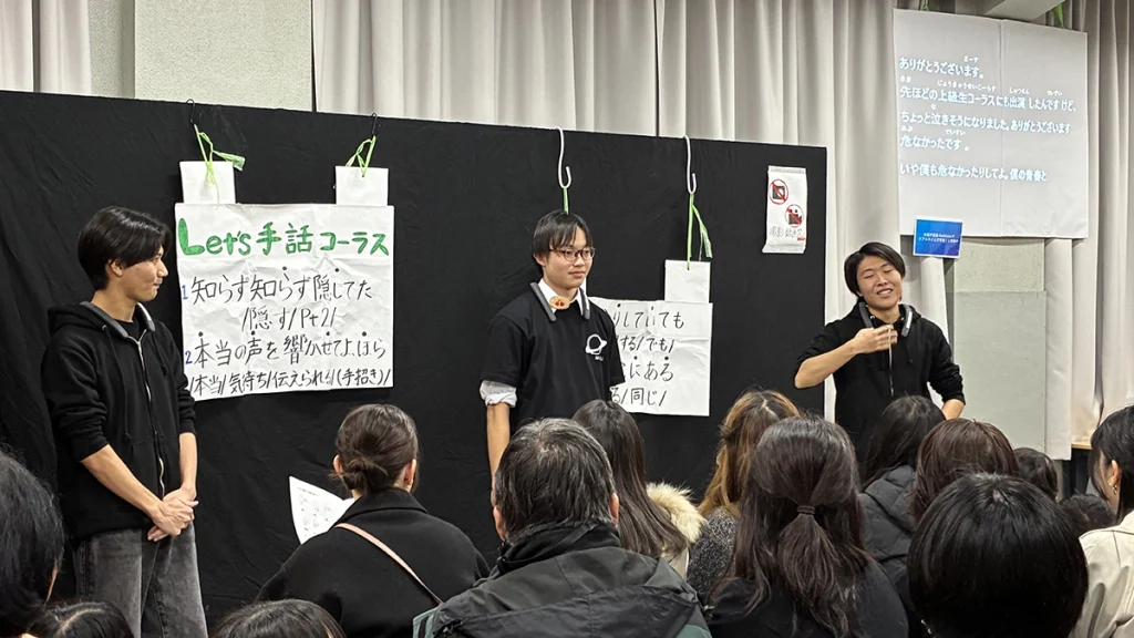 リアルタイム字幕は、手話コーラスを解説しながら来場者と一緒に楽しむ企画「Let’s手話コーラス」で活用されました。手話のやり方を説明する音声がスクリーンに字幕表示されることで、ろう・難聴者や説明を聞き取りづらい来場者にとって大きな助けとなりました。