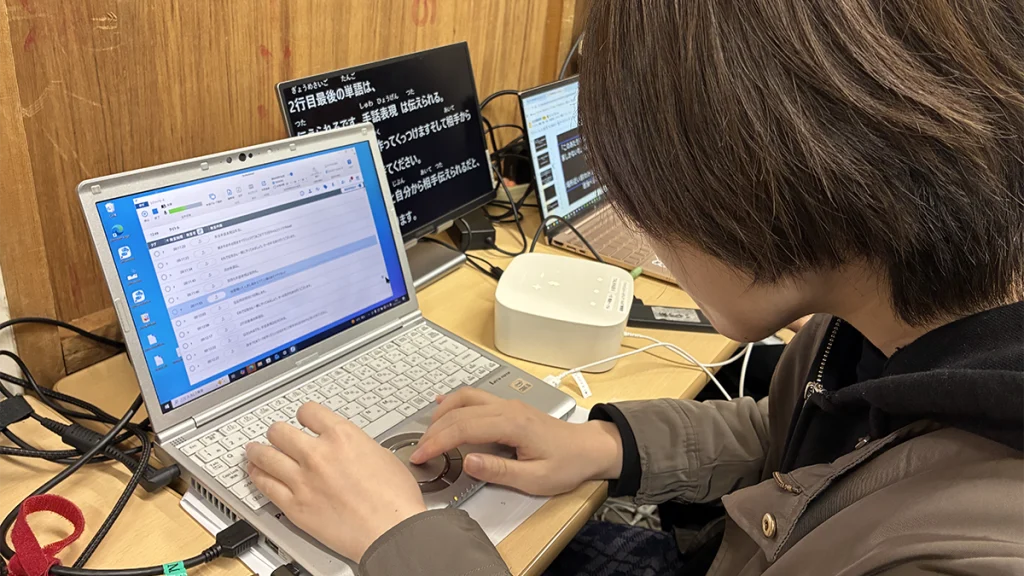 アドリブ部分は、リアルタイムに文字起こしされた内容を修正して表示しており、誤認識を修正する担当と原稿を送信する担当の2人体制が必須でした。