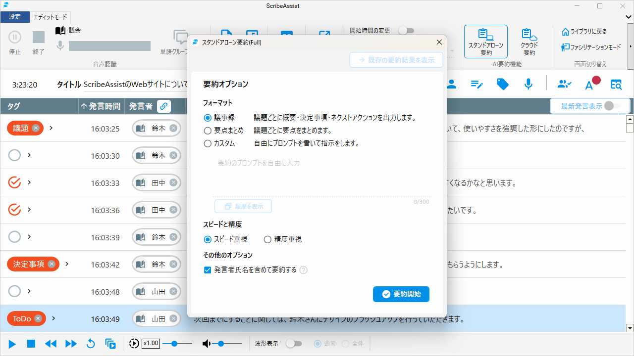 文字起こしや議事録(要約結果)の編集が可能なWebアプリです。AI要約から議事録編集、ファイル出力、URL共有までを一括で行えます。
