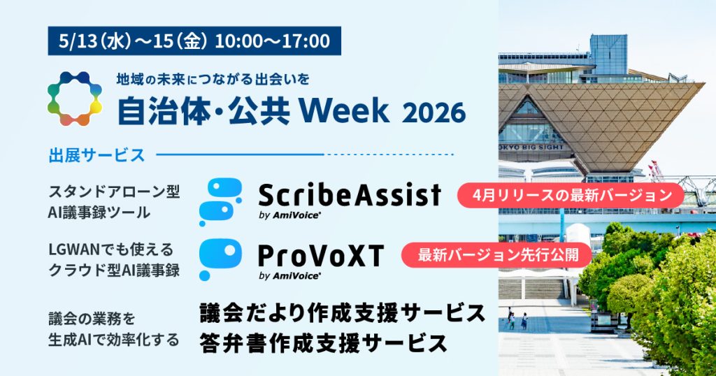 当社ブースでは、シェアNo.1のAI音声認識AmiVoiceを搭載したスタンドアローン型AI議事録ツール「ScribeAssist」の4月にリリースした最新バージョンや、LGWANで利用できるクラウド型サービス「ProVoXT」の最新バージョン(先行公開)、自治体業務を効率化する「議会だより作成支援サービス」「答弁書作成支援サービス」などをデモンストレーション交えてご紹介します。