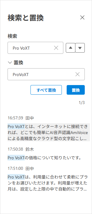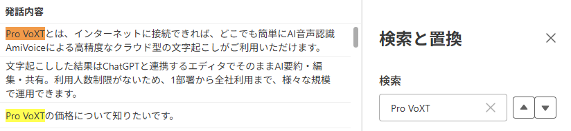 文字起こしエディタ(文字起こし結果の編集画面)でテキストの一括置換ができるようになりました。誤認識などを一気に修正できるため、編集作業がより効率的になります。