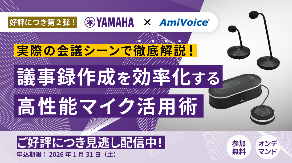 本ウェビナーでは、議事録ツールの導入効果を最大限に引き出す活用方法を、ヤマハ様のマイクを例に実際のご利用シーンでのデモも交えながらご紹介します。ぜひお気軽にお申し込みください。
