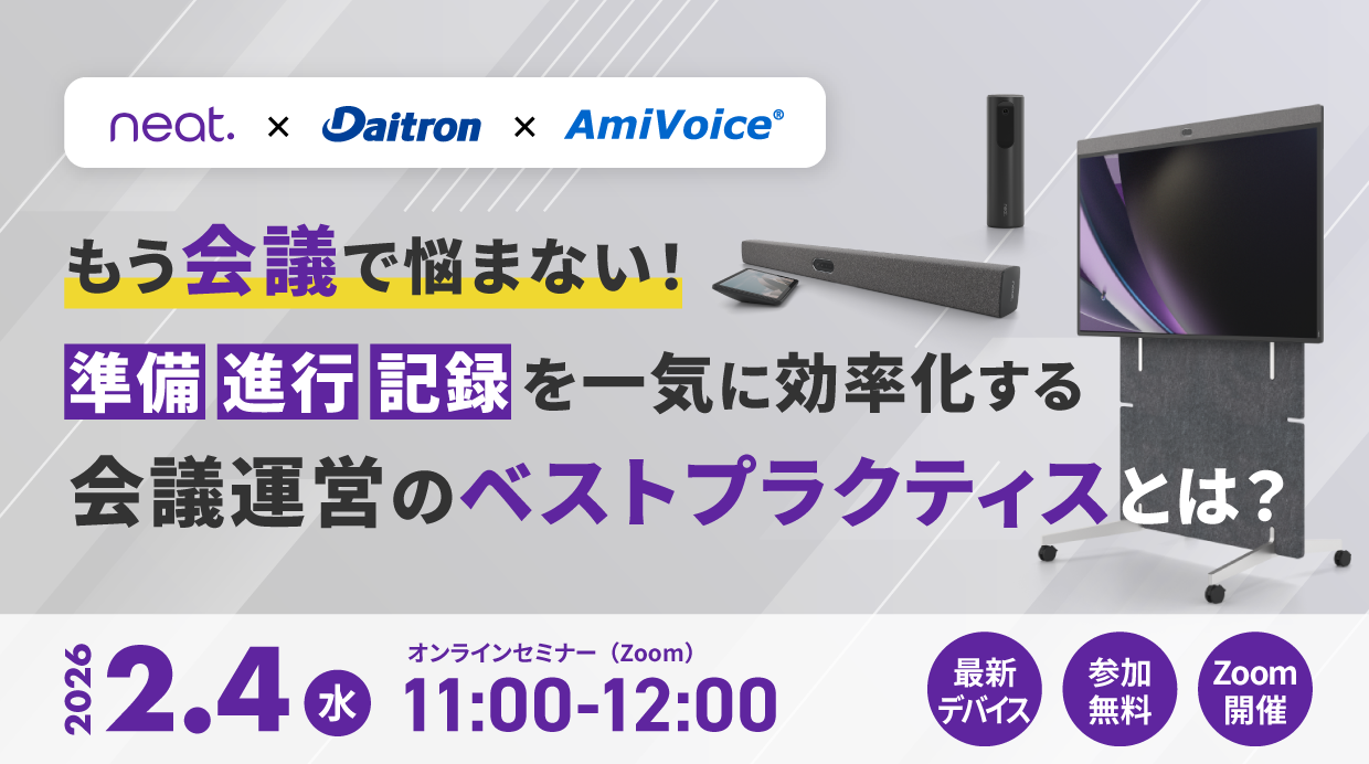 本ウェビナーでは、「Neat ビデオ会議デバイス」と、音声認識を活用したAI議事録ツール「ScribeAssist」を組み合わせ、会議準備~開催~議事録共有までを一気通貫で効率化する方法を、わかりやすく解説。デモンストレーションも交えながら、会議開始から終了までの流れに沿ってすぐに活用できるポイントをステップごとにご説明します。