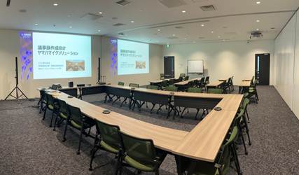 ■実際の会議シーンを模したデモで、配置方法や両製品を組み合わせた使い方のコツの説明